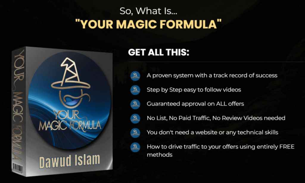 Your Magic Formula is a low-cost, high-impact affiliate marketing system designed by veteran marketer Dawud Islam, who is a Top 5% Affiliate and Top 10% Vendor on WarriorPlus. The system revolves around a simple idea: give away a 26-video training course for free, and earn 50% commissions on the entire sales funnel.