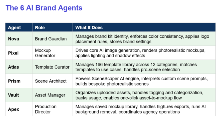Behind the scenes, six AI agents handle different tasks such as branding, rendering, asset management, and production.